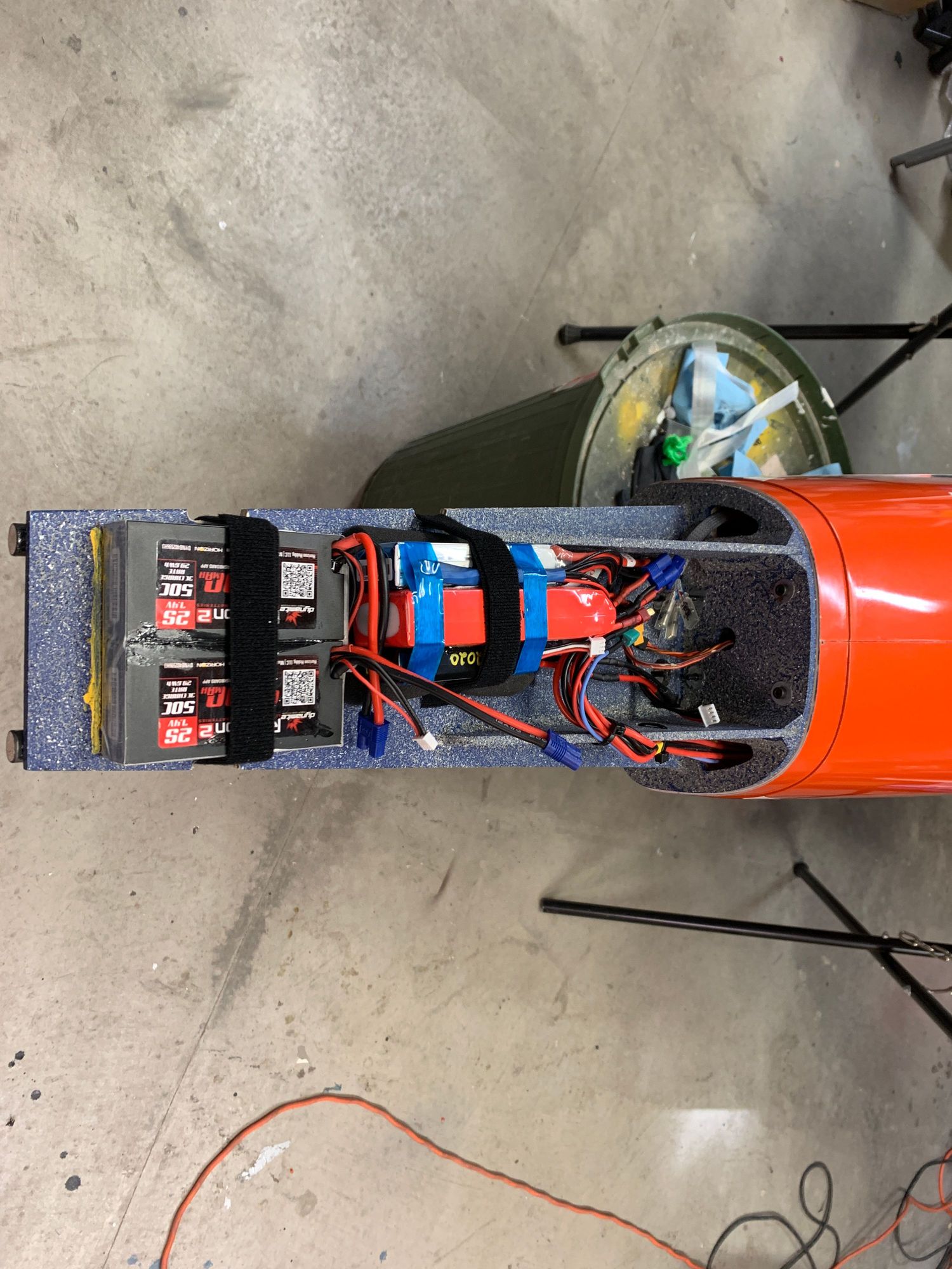 Final Battery placement. Space at front of tray for stick on Lead weights.