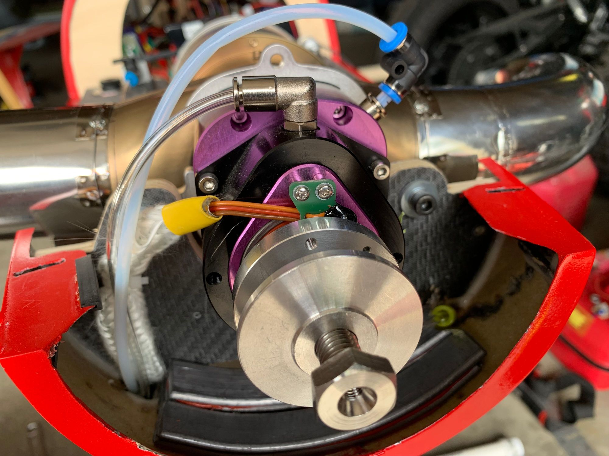 Jetcat SPT10 installation. Duck decoy weights in bottom of nose to adjust CG. As per Danny Diaz helpful recommendations ran all lines underneath and shielded with fiberglass heat shields from McMaster and also wrapped those aluminum tape.