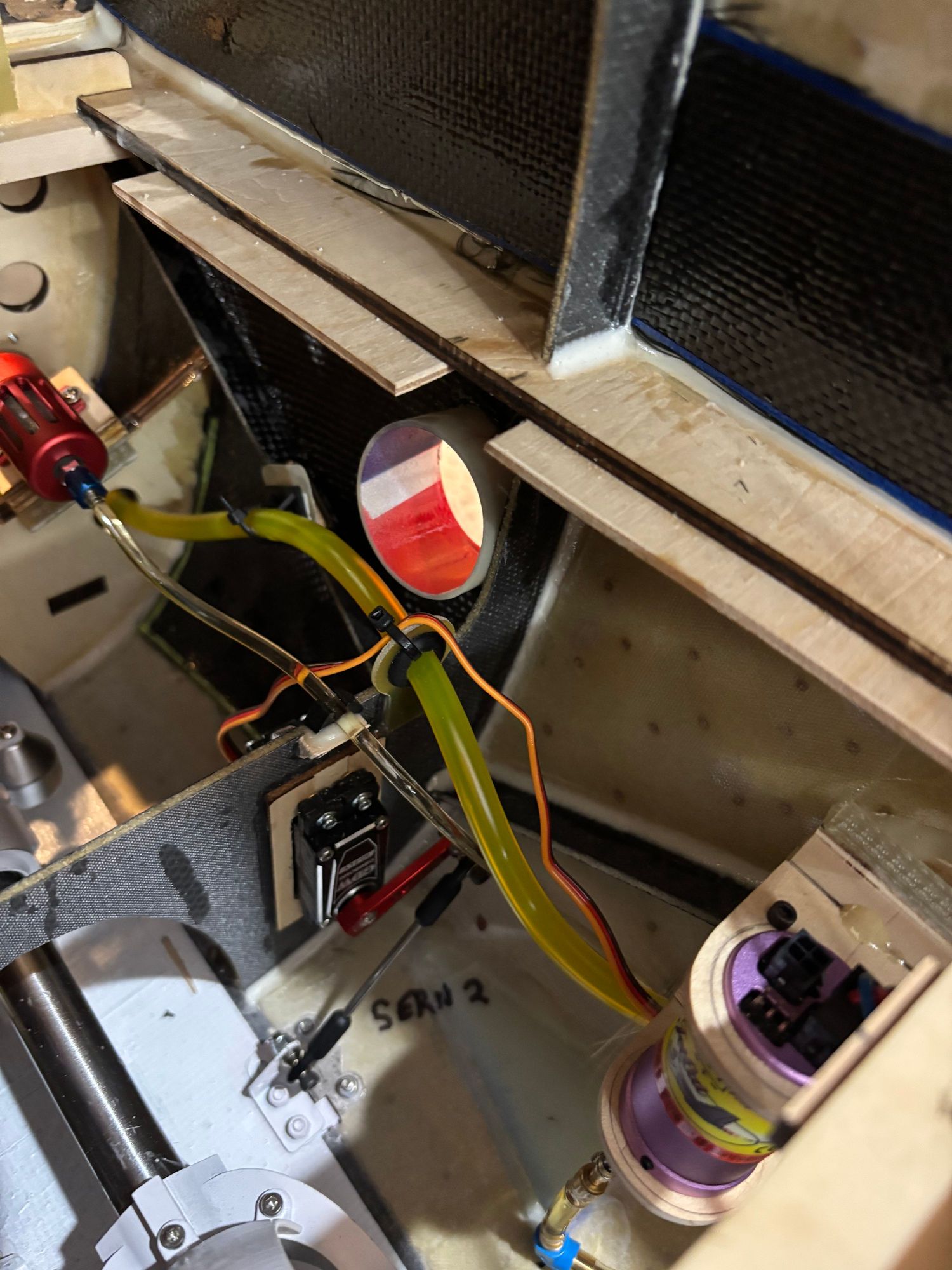 I quickly realized trying to use an oscillating saw in the front lower confines of the fuselage would be extremely difficult. So I gave up trying to run a continuous ribbon of carbon fiber below the equipment tray. Instead I made up paper templates for each of the “compartments” to make carbon fiber quilt work. Didn’t take long to laminate in place. The triangle in front of the fuel pump I used fiberglass cloth. I’ll be moving the receivers more rearward away from the carbon fiber